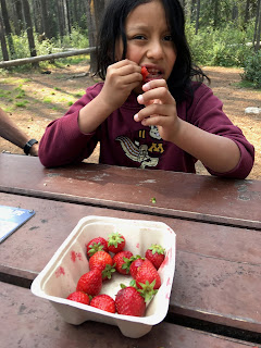 My original plan was to go to the coffee shop/laundromat/wifi cafe in Jasper which had great reviews and would solve our deteriorating laundry problem. But that would add significantly to our travel time so I called the hotel we would be staying at in a couple days to see if they had guest laundry and lo and behold they did. So we gritted our teeth and accepted the fact that we would be in double re-runs of clothes but at least our underwear supplies would hold out. The promise of wifi and a beverage and a treat was too strong though so I got Gordon and the kids settled in at the cafe and then headed out to forage. Danny remembers this stop as the time it took 20 minutes to figure out how to get wifi working on his Kindle. We all remember it for the beautiful steamed milk designs on the kids’ hot chocolate.